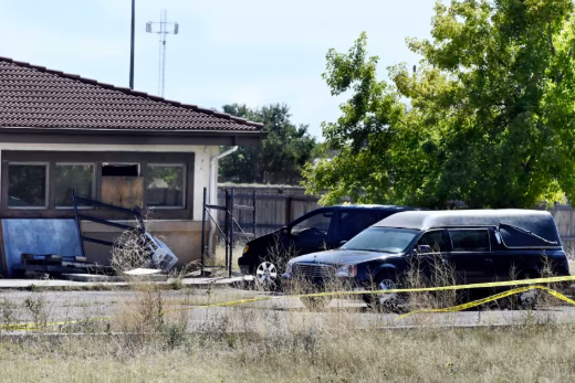 FILE – A hearse and debris can be seen at the rear of the Return to Nature Funeral Home, October 5, 2023, in Penrose, Colorado.